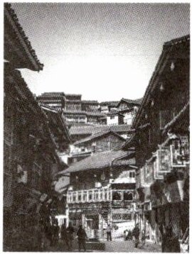 贵州西江千户苗寨以层层错落的吊脚楼为典型建筑。右图为西江千户苗寨的景观图。据此完成1~3题。