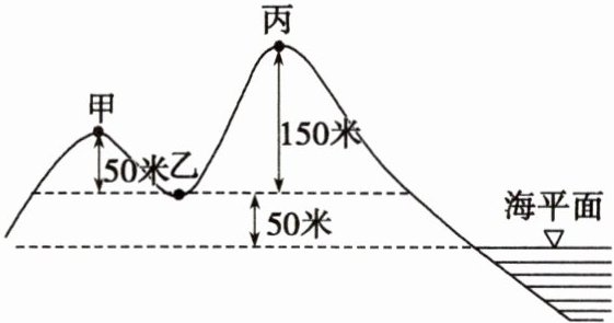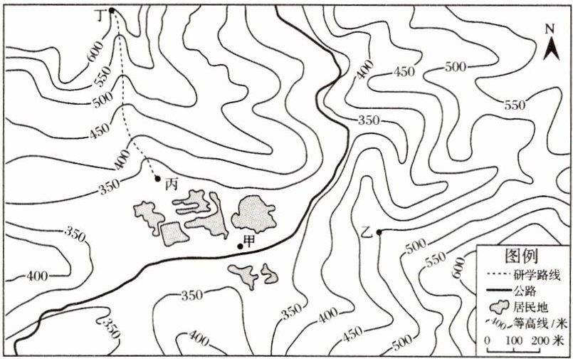 7. 研学路线上丙地与丁地的相对高度可能是(