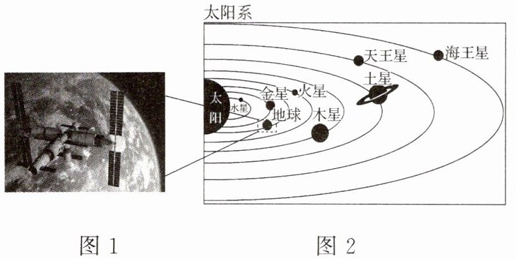 2025 年 4 月 24 日 17 时 17 分,神舟二十号载人飞船在酒泉卫星发射中心发射成功。图 1 为中国“天宫”空间站,图 2 为太阳系示意图。据此完成 5~6 题。