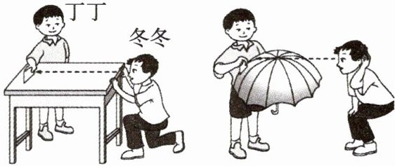 图中丁丁和冬冬在进行地理实验探究,丁丁手持的小船模型沿着桌面和伞面逐渐向冬冬靠近或离开。据此完成 8~9 题。