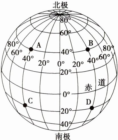 (3) A、B、C、D 四点中,位于中纬度地区的是