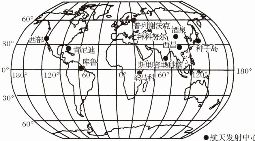 世界十大航天发射中心指航天科技发展半个世纪以来,各航天大国相继建立的功能齐备、设施完善的航天发射中心。下图为世界十大航天发射中心分布示意图。据此完成 7~8 题。