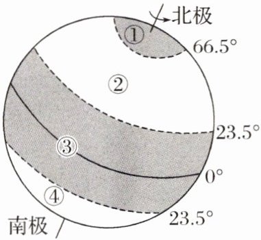 8. 下图中的数码分别表示地球上的五带。地球五带中,有极昼、极夜现象,气候终年严寒的是(