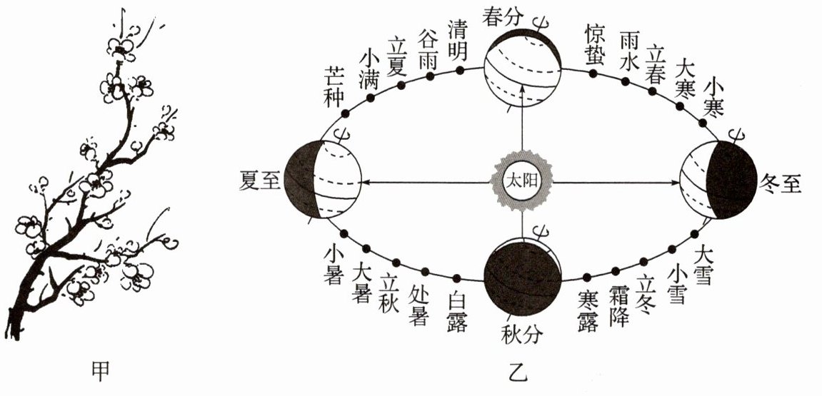 数九是我国古代民间一种计算寒天的方法,从冬至日算起,每九天算“一九”。人们用墨笔每天晕染一瓣梅花,九九八十一天过后,梅花点遍,春回大地。图甲是九九消寒图,图乙是地球公转示意图。据此完成9~10题。