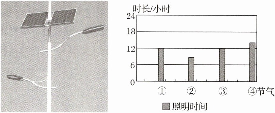 太阳能是地球上最普遍也是最清洁的能源,作为一种可再生能源,因环保、安全,越来越受重视。当下,太阳能发电在路灯照明领域发展已经日趋完善,广泛用于乡村、公园、广场、园林、街道、学校、各种住宅小区、庭院等道路照明。下图为山西省运城市某街道太阳能路灯景观图及照明时长图。据此完成11~12题。