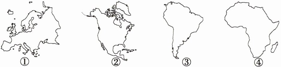 6. 下图为四个大洲的大陆轮廓图。全部位于北半球的大洲有(