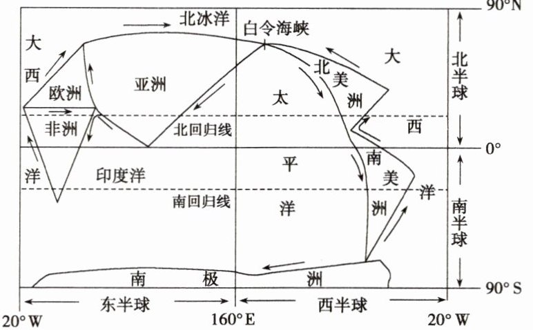 小顺同学通过“一笔画世界”活动学习世界的海陆分布。下页图为小顺同学的作品。据此完成6~7题。
