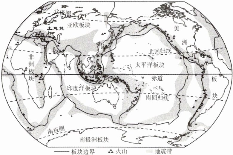 [自然灾害与防御主题]土耳其是地震多发的国家。2025 年 5 月 1 日,土耳其发生 6.4 级强烈地震,人员伤亡严重。下图为全球六大板块分布图。据此完成 3~4 题。