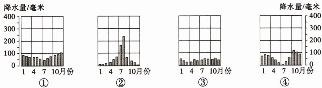 下图为北半球①②③④四地的降水量柱状图。据此完成7~9题。