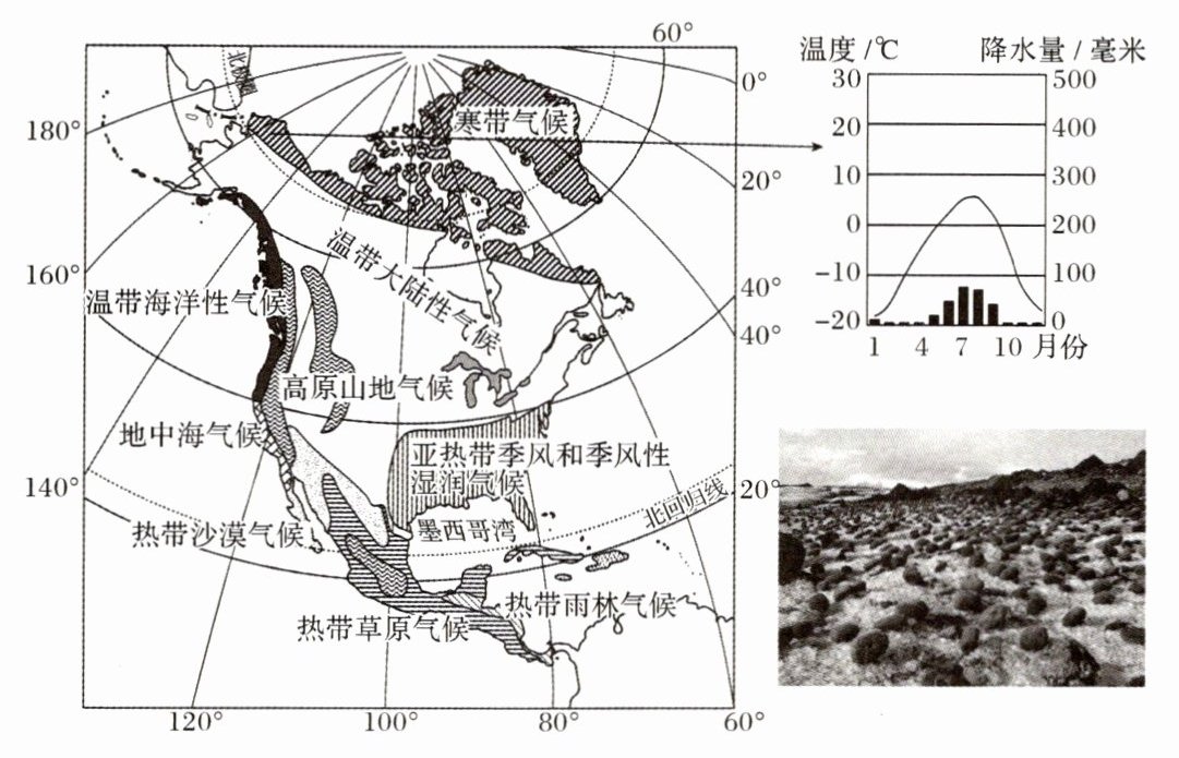 北美洲北部的冰面上生长着一种苔藓球,靠暖季在冰面上滚动来获取生长所需的光照,吸取冰面少量融化的液态水来维持生存,被称为“冰川老鼠”。下图是北美洲气候类型分布图、苔藓球分布地区气候资料及冰面上的苔藓球照片。据此完成1~2题。