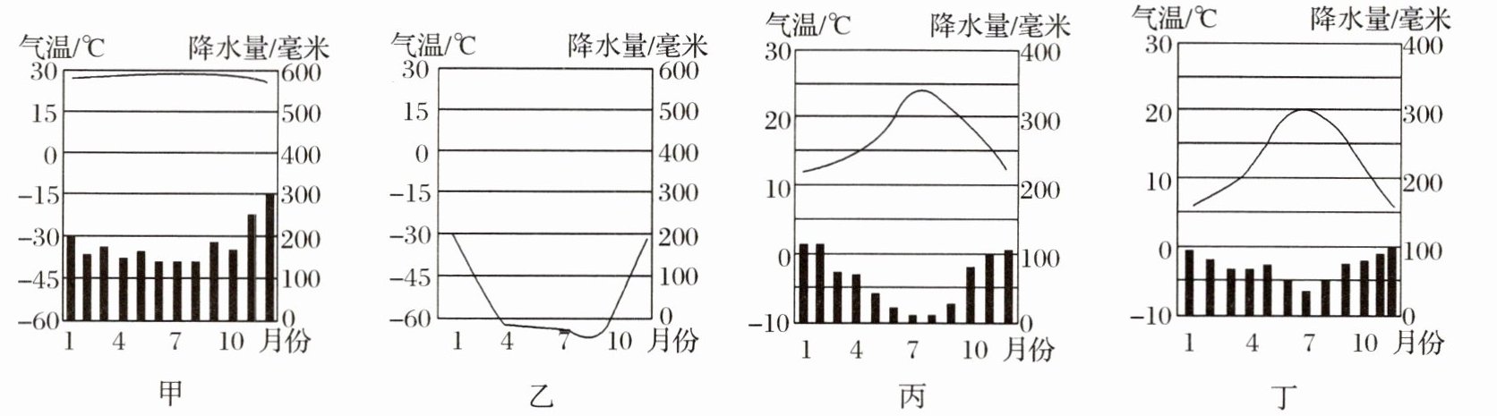 下图为甲、乙、丙、丁四地气温变化曲线和降水量柱状图。据此完成 14~15 题。
