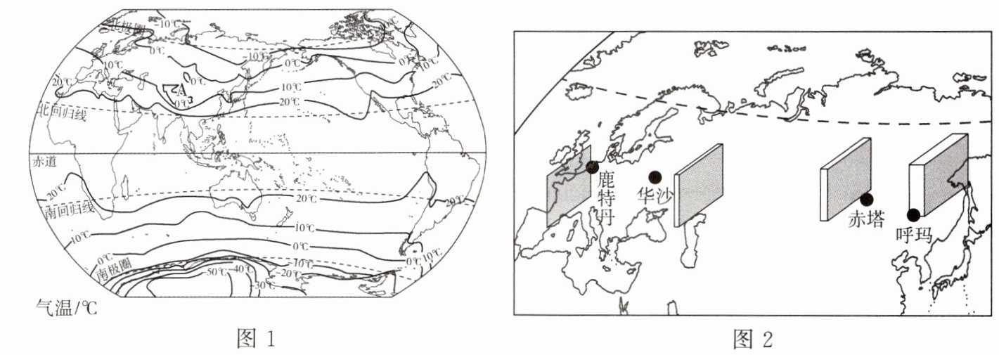 17. 人们经常用“嘘寒问暖”表示相互关心,其实“寒”和“暖”在世界上的分布是有规律的,并且影响着人们的生活。读世界年平均气温分布图(图 1)与亚洲和欧洲地区传统民居的墙壁厚度示意图(图 2),回答下列问题。