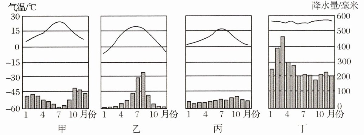 (2)丁 全年高温多雨 地中海气候 夏季炎热干燥,冬季温和多雨