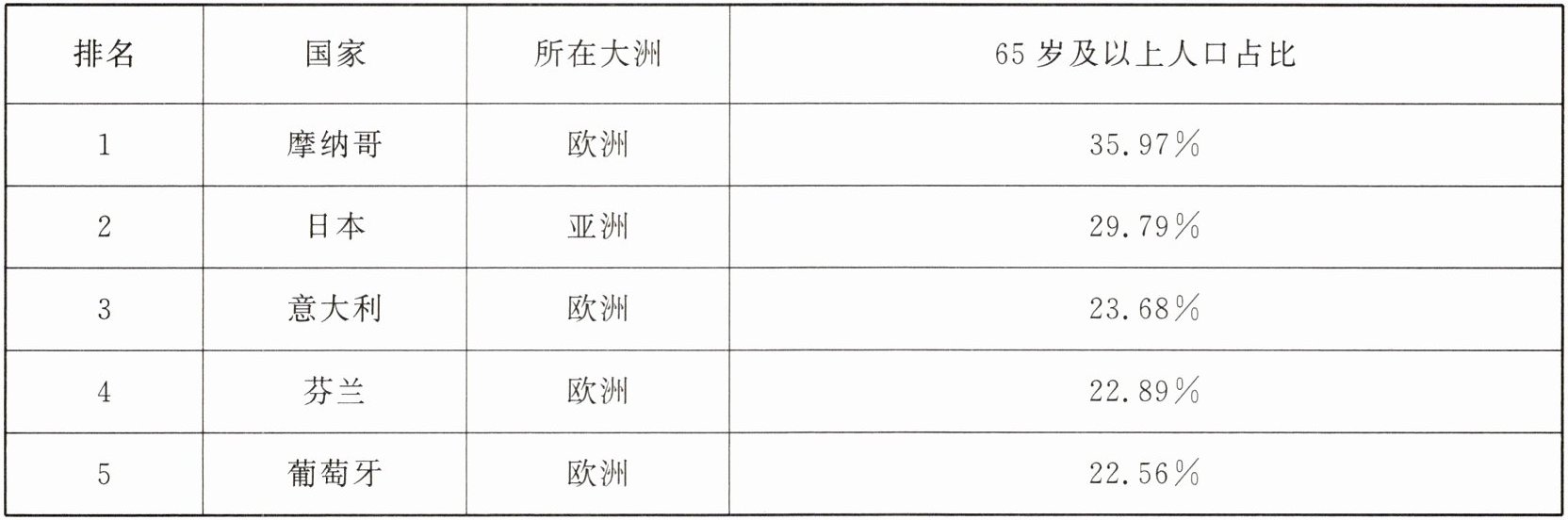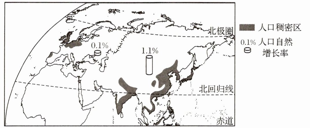 亚洲是人口最多的大洲,分布着世界一半以上的人口;欧洲是世界上人口自然增长率最低的大洲。下图为亚洲和欧洲人口稠密区分布及人口自然增长率示意图和某年世界 65 岁及以上人口占比前五名的国家统计表。据此完成 3~4 题。