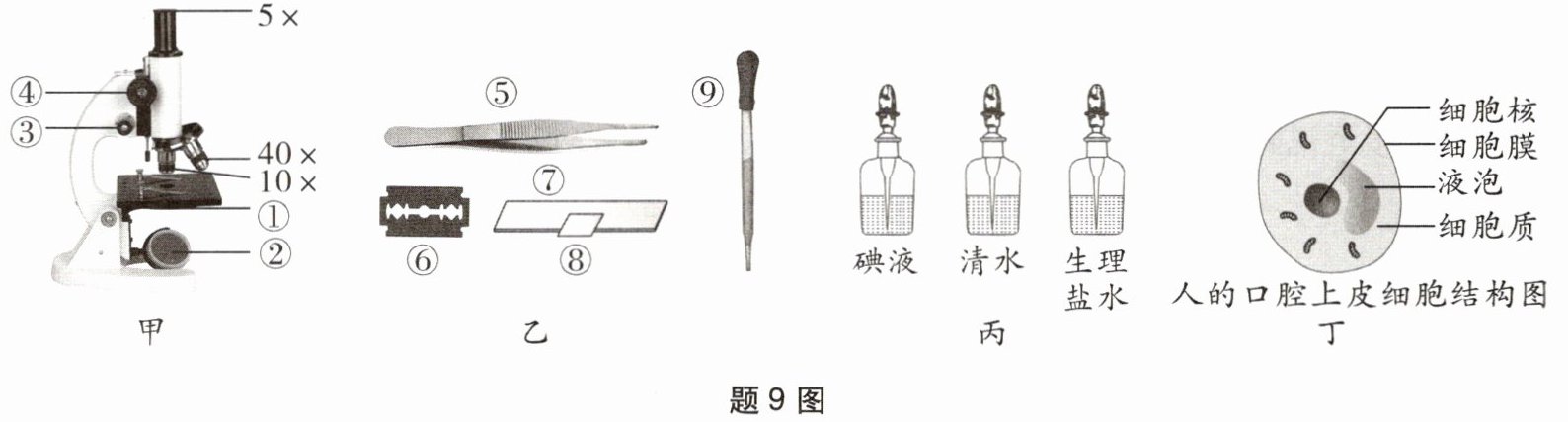 9. (实验探究) 题9图是“观察人的口腔上皮细胞临时装片”实验的相关示意图。