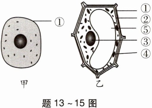 【主题】诗句“桃花流水鳜鱼肥”中提及两种生物,题13~15图是这两种生物的细胞模式图。请完成13~15题。