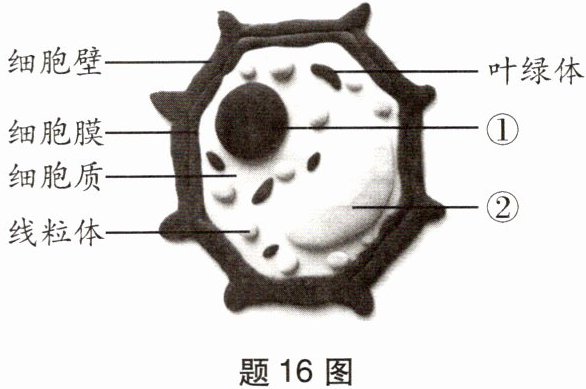 16. 学习了细胞的结构和功能后,某同学用黏土等材料制作了一个植物细胞的结构模型 (如题16图)。
