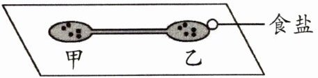 【例】下图载玻片上滴有甲、乙两滴草履虫培养液,用解剖针连通两滴培养液,并在乙的右侧放一小粒食盐。请你利用生物能对外界刺激产生反应的原理,推测草履虫将(