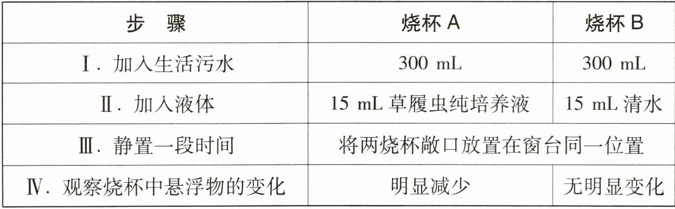 能把体内多余的水分和废物收集起来,排出体外。(4) 为了研究草履虫是否可以净化水质,同学们收集生活污水,摇匀后分别放入两个烧杯中,处理步骤如下表所示。(注:悬浮物指悬浮在水中的固体物质,是监测水质的指标之一)