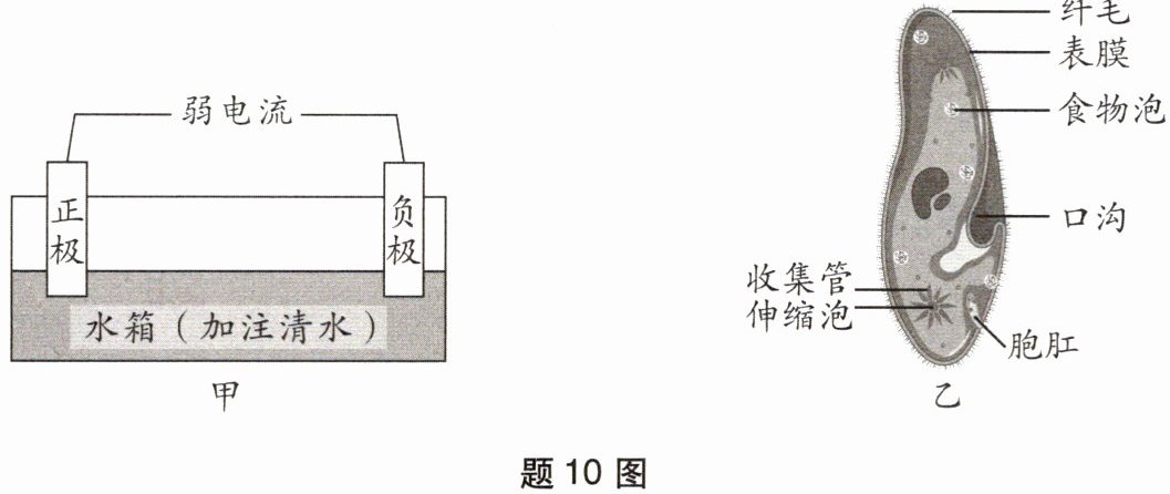 10. 同学们要分离水样中的草履虫,进行纯培养。已知草履虫在微弱电流刺激下会由正极游向负极,他们设计了水槽电极法分离草履虫的装置(如题10图甲)。图乙是同学们在显微镜下观察到的草履虫的结构示意图。