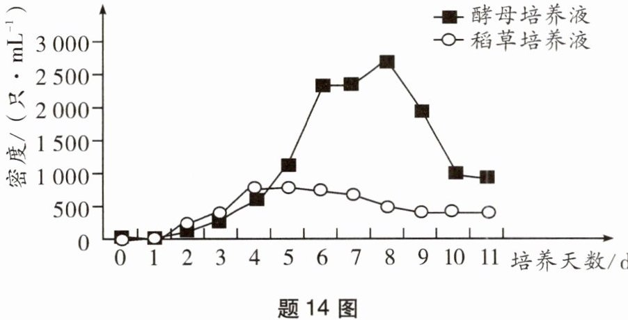 【主题】 草履虫是一种身体很小、圆筒形的原生动物,它只由一个细胞构成,是单细胞生物。生物学兴趣小组的同学用显微镜观察草履虫,并开展实验,研究酵母和稻草两种培养液对草履虫数量增长的影响。请完成13~15题。