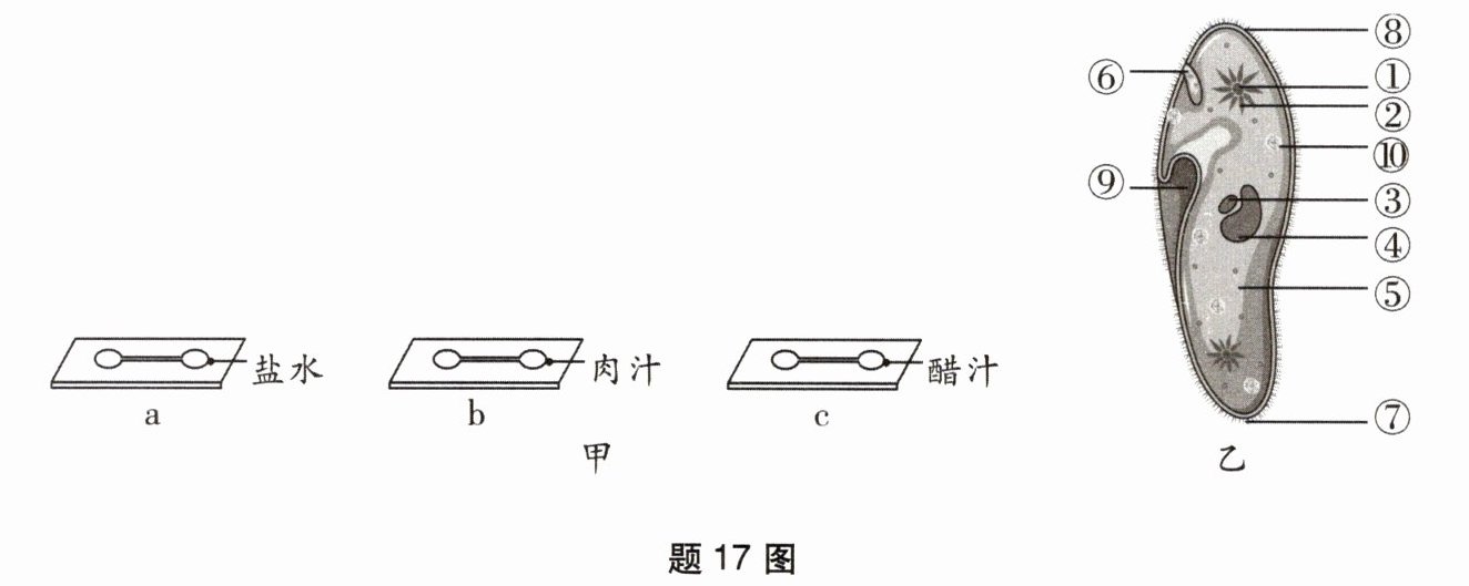 ①取甲、乙、丙三个载玻片(如题17图甲),分别在其两端各滴一滴草履虫培养液,并使其相互连通;②在甲、乙、丙三个载玻片右侧培养液边缘分别滴一小滴盐水、一小滴肉汁、一小滴醋汁;③用显微镜观察发生的现象,分析得出结论。