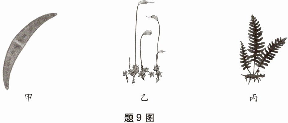 9. (综合应用) 某校生物学兴趣小组的同学在游学时采集了若干种生物,带回实验室观察。题9图是几种生物的示意图。