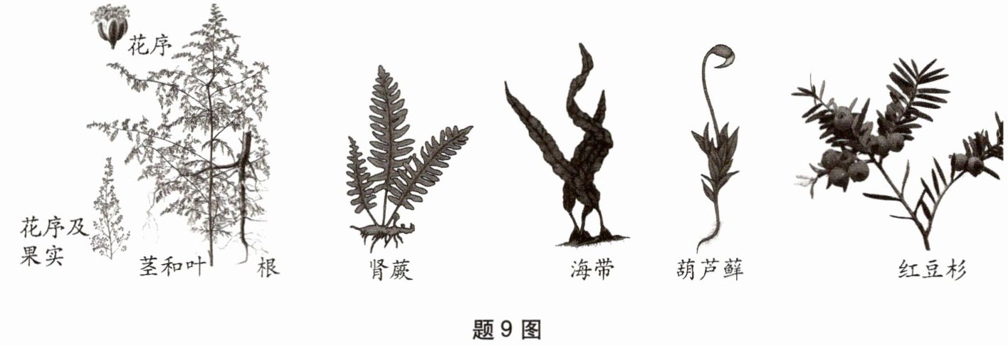 9. (综合应用)中国科学家屠呦呦以创新型抗疟疾药物青蒿素和双氢青蒿素成为第一个获得科学类诺贝尔奖的中国人。青蒿素是从复合花序植物黄花蒿(俗称“臭蒿”)中提取得到的一种无色针状晶体,青蒿素药物至今仍然是世界范围内最主要的抗疟药物,此外青蒿素能够让产生胰高血糖素的α细胞“变身”产生胰岛素的β细胞,或可治疗糖尿病。如题9图所示为黄花蒿部分外形结构示意图及其他生物形态示意图。