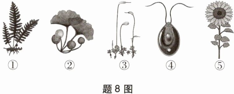 8.D 解析:植物①属于蕨类植物,具有输导组织,长得比较高大,选项D错误。
