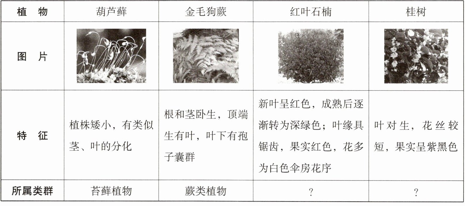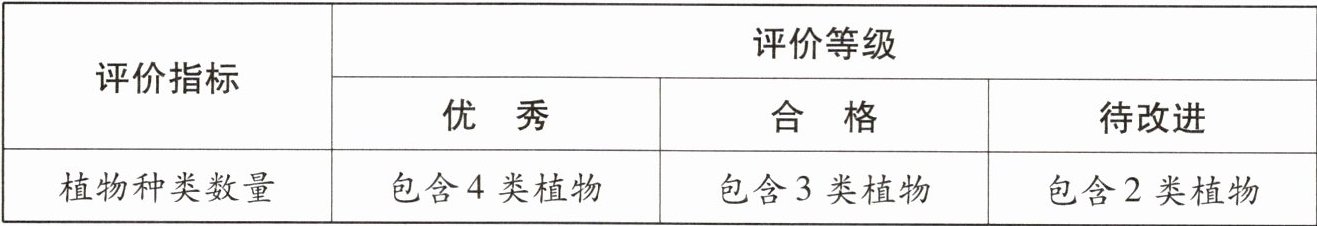 (2)评价等级为合格。葫芦藓属于苔藓植物,金毛狗蕨属于蕨类植物,红叶石楠和桂树都具有果实,属于被子植物,一共包含3类植物