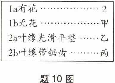 (3)题10图是小组对上述四种植物编制的检索表,请判断乙代表的植物是