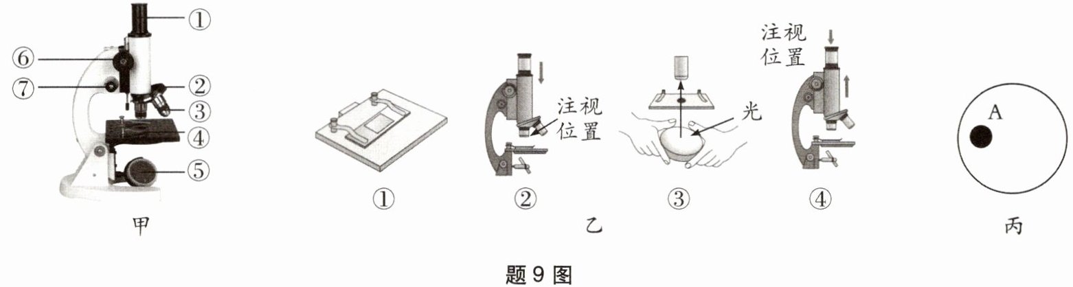 (填序号)。(5) 题9图丙中的A是在视野中看到的一个细胞,若要把它放大,先要将它移到视野的中央。此时应将装片向