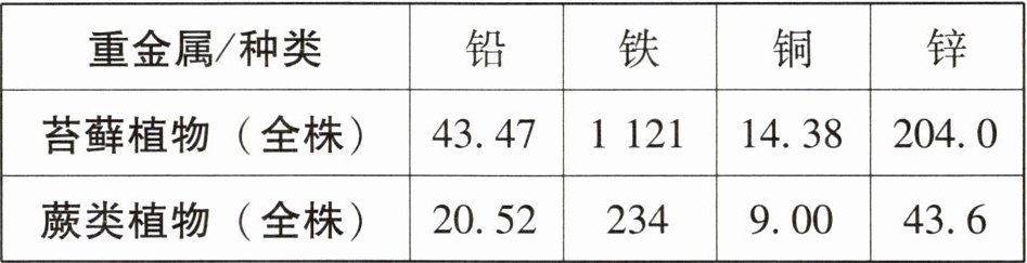 (3) 生物学习小组通过查阅资料发现:同一生活环境中的苔藓植物与蕨类植物体内的重金属含量不同,具体数值如下表 (单位:mg/kg)。