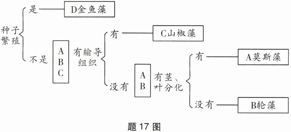 17. 鱼缸造景是一门新兴的艺术。金鱼藻、莫斯藻、轮藻、山椒藻等水草都是常用的造景生物。题17图为这4种水草的分类图。