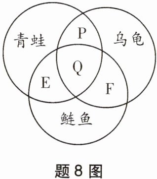 8.D 解析:青蛙与鲢鱼的卵都产在水中,选项A错误;鲢鱼只能生活在水中,选项B错误;乌龟的卵产在陆地,选项C错误;青蛙、鲢鱼、乌龟都属于脊椎动物,选项D符合题意。
