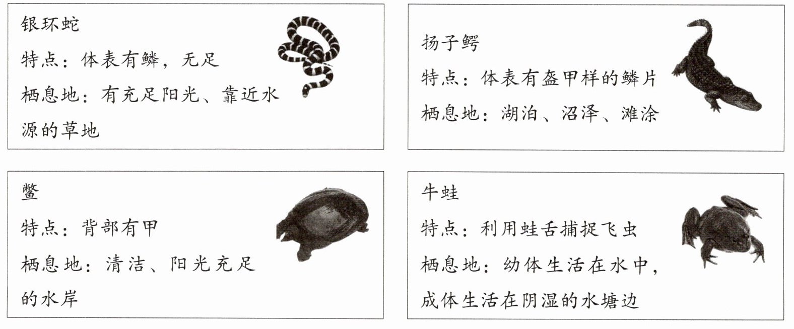 9. (读图理解) 同学们在研学时参观了动物园中的爬行动物馆和两栖动物馆,为其中几种动物制作了名片,如题9图所示。