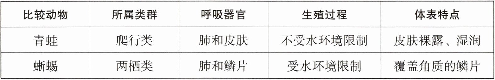 7. 下表是青蛙和蜥蜴四项特征的比较,其中正确的一项是(