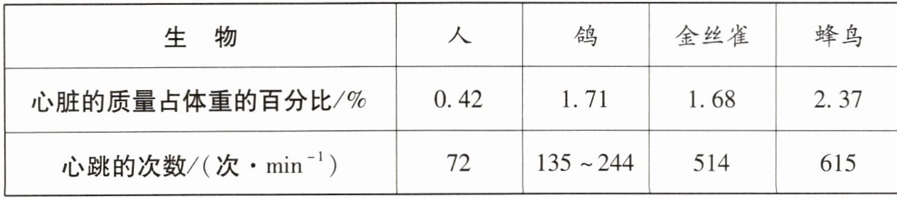 资料二: 下表所示的是人与几种鸟的心脏质量占体重的百分比及每分钟心跳的次数。