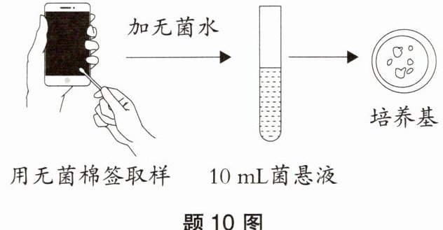 (1) 如题10图所示,在固定区域用无菌棉签从手机屏幕取样,制成菌悬液,然后将该菌悬液在培养基上涂抹,这个步骤即为