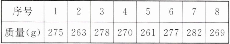 12. 排球的国际标准指标中有一项是排球的质量,规定排球的标准质量为$(270\pm 10)$g,现随机选取 8 个排球进行质量检测,结果如表所示: