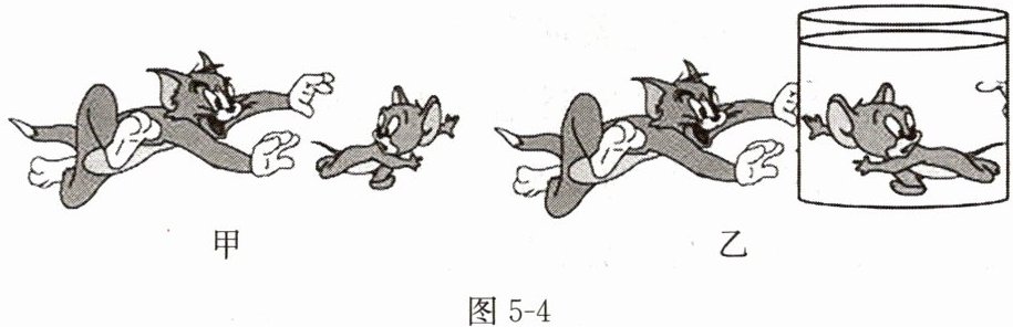 6. 小张将一个装有水的圆柱形玻璃杯放在漫画前,惊奇地发现透过水杯看到漫画中的老鼠变“胖”了,还掉头奔向猫,如图5-4所示。关于此现象,下列说法正确的是(