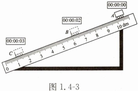 7. 某物理兴趣小组用如图1.4 - 3所示的实验装置测量小车运动的速度。实验中,他们将小车从带刻度(分度值为1cm)的斜面顶端A点由静止释放,并同时按下电子秒表开始计时,图中方格内显示了小车位于A、B、C三点的时刻(数字分别表示“时:分:秒”)。