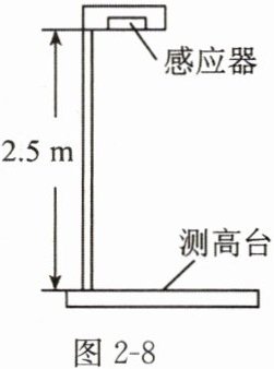 13. 如图2-8所示为一种身高测量仪,其顶部的感应器竖直向下发射超声波信号,经下方物体反射后返回,被感应器接收。某同学站上测高台,感应器记录信号从发射到接收所经历的时间为5×10⁻³s。已知感应器距测高台的高度为2.5m,若空气中的声速为340m/s,则该同学的身高为(