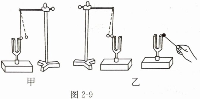 14. 如图2-9甲所示,用竖直悬挂的塑料小球接触发声的音叉时,塑料小球被弹起,这个现象说明____;如图2-9乙所示,敲击右边的音叉,左边完全相同的音叉把塑料小球弹起,这个现象说明____。