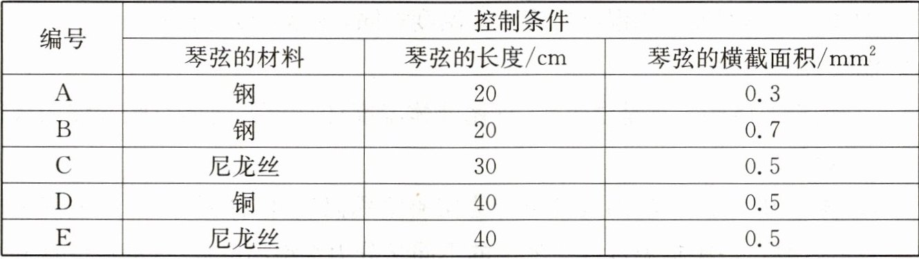 21. 小兰在观察提琴、吉他、二胡等弦乐器的弦振动时,猜想:在琴弦绷紧程度相同的条件下,发声的音调高低可能与琴弦的粗细、长短及琴弦的材料有关。于是她想通过实验来探究一下自己的猜想是否正确,她在实验时控制的琴弦条件如表所示。