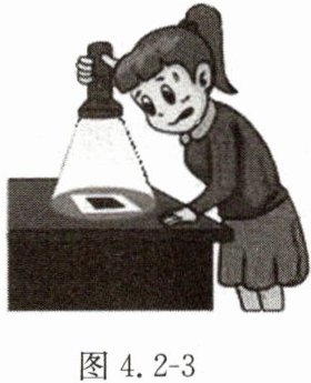 5. 晚上,在桌面上铺一张白纸,把一小块平面镜平放在纸上,让手电筒的光正对着平面镜照射,如图4.2-3所示,则从侧面看去(
