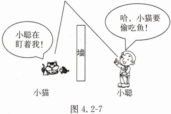 10. 如图4.2-7所示,小聪通过一个平面镜看到小猫要偷吃小鱼。图中画出了入射光线和反射光线,但未标出光的传播方向。请你在图中用箭头标出小聪看到小猫偷吃鱼时的光的传播方向,并根据光的反射定律画出平面镜。