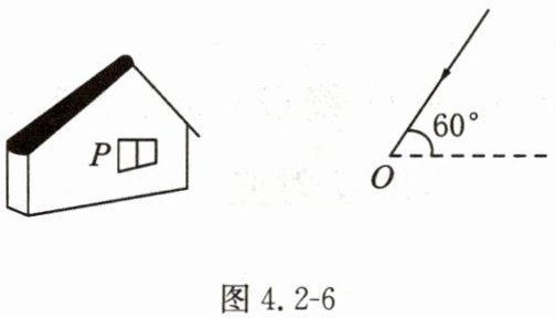 9. 如图4.2-6所示,在O点放置一个平面镜,使与水平方向成60°角的太阳光经平面镜反射后,水平射入窗口P中。请你在图中画出平面镜的位置,并标出反射角的大小。