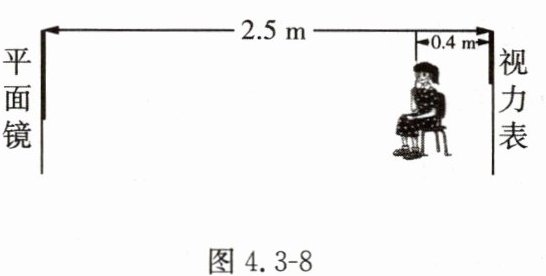 10. 如图 4.3 - 8 所示,在检查视力时,医生让小红观察前方平面镜中的视力表来确定视力。实际上,视力表在小红的后方,她在镜中看到的视力表是等大的______像。小红为了看清平面镜中视力表下面几排字母的像,向平面镜走去。在她走向平面镜的过程中,字母的像的大小将______,她与字母的像的距离将______。若某一时刻小红的眼睛与视力表实物的距离为$0.4m$,视力表与平面镜的距离为$2.5m$,则她与镜中视力表的距离为______$m$。小红所在房间光线较暗,为了让小红看清镜中的视力表,应将光源照向______(选填“平面镜”或“视力表”)。