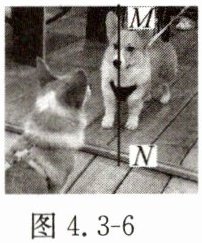 7. 宠物狗的正前方竖立着一面镜子,它正在欣赏镜中的自己(如图 4.3 - 6 所示)。假设宠物狗不动,把平面镜沿$MN$截成两半,并分别向两侧平移一段距离(两块镜面仍然在原镜面平面内),则宠物狗通过左、右两面镜子(